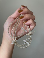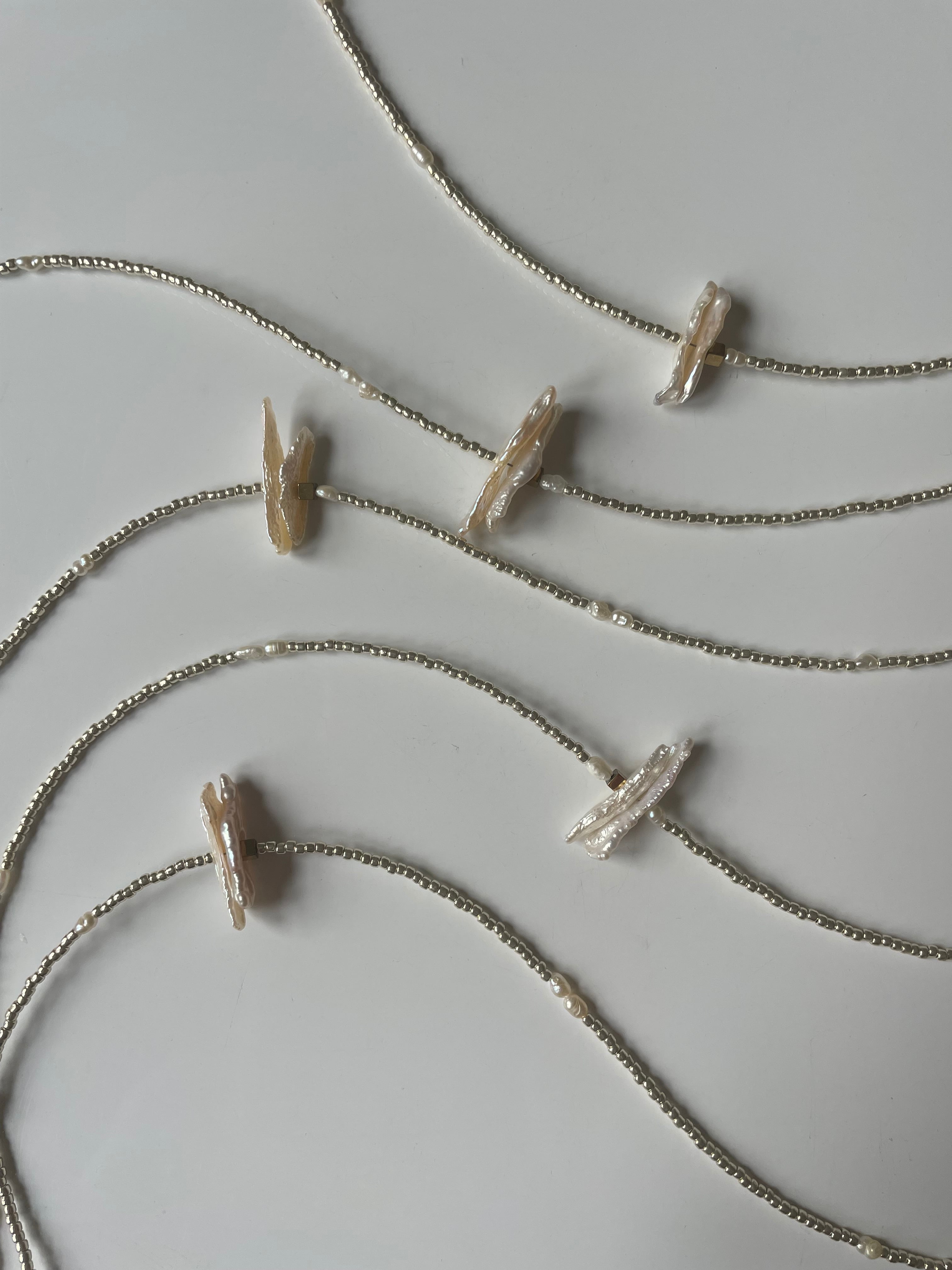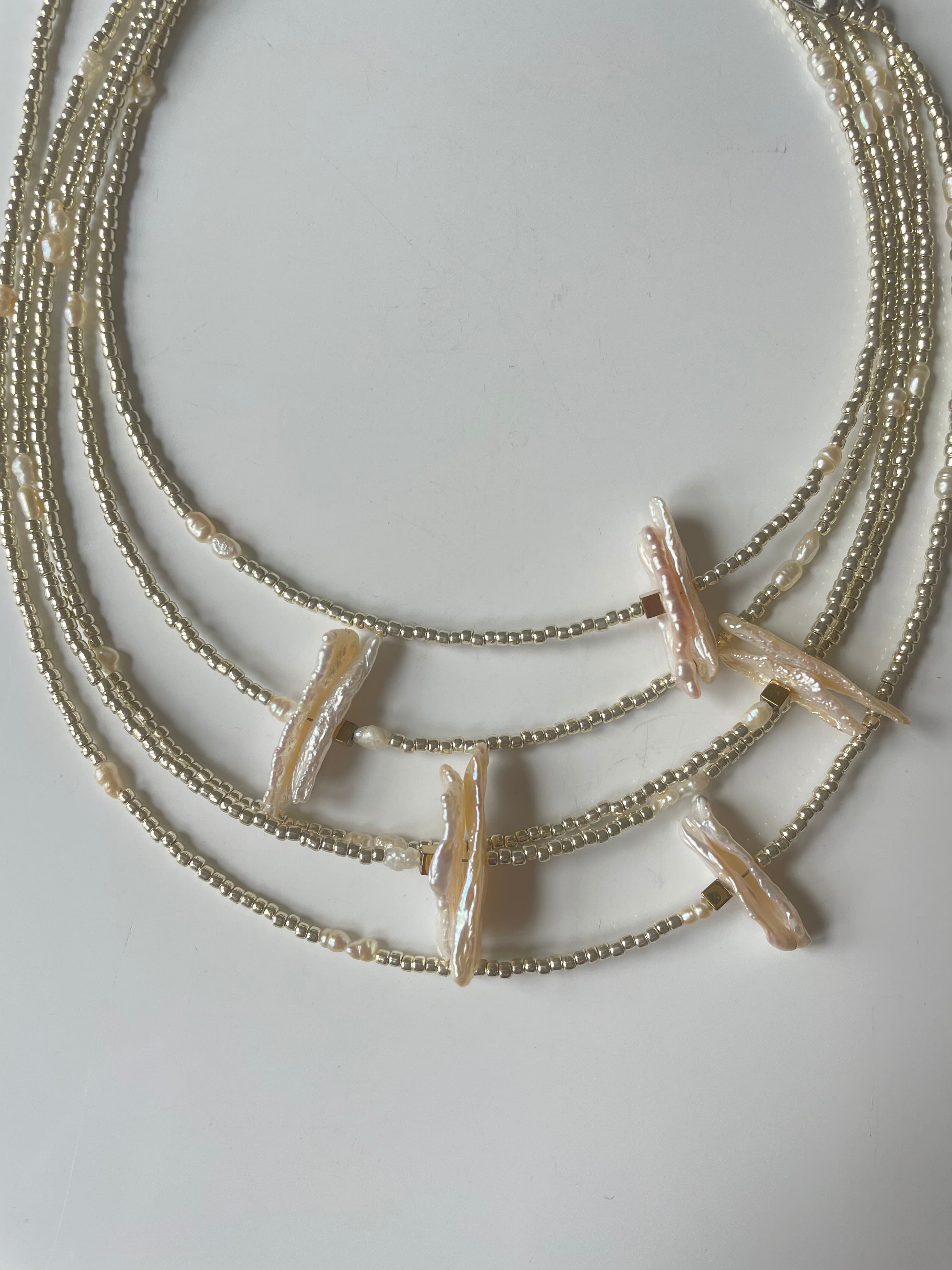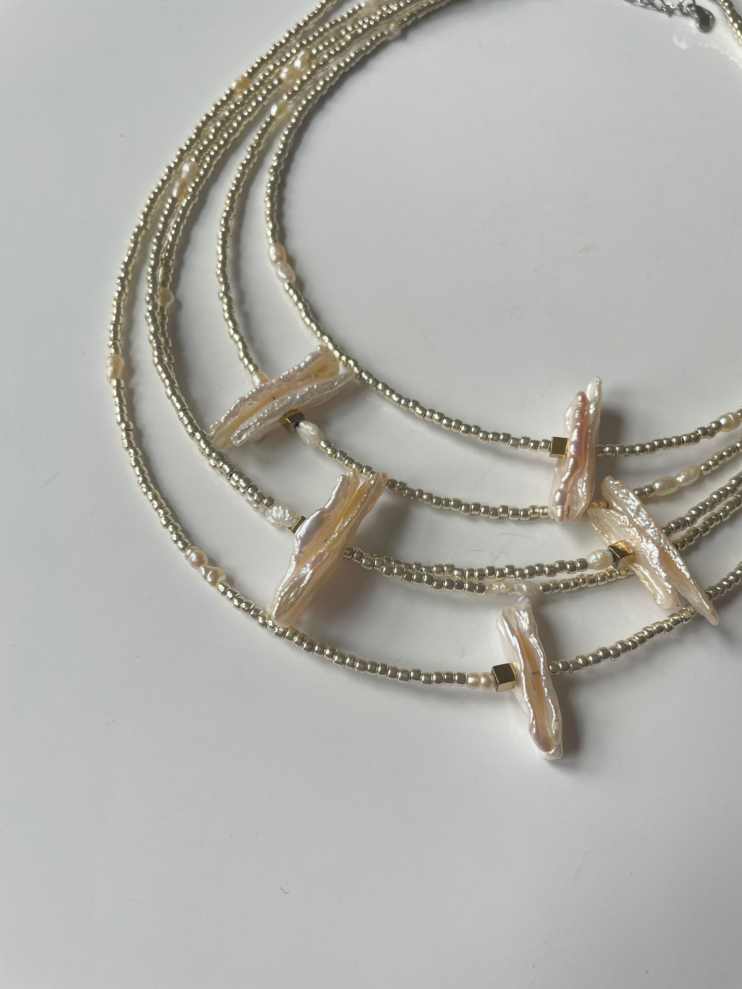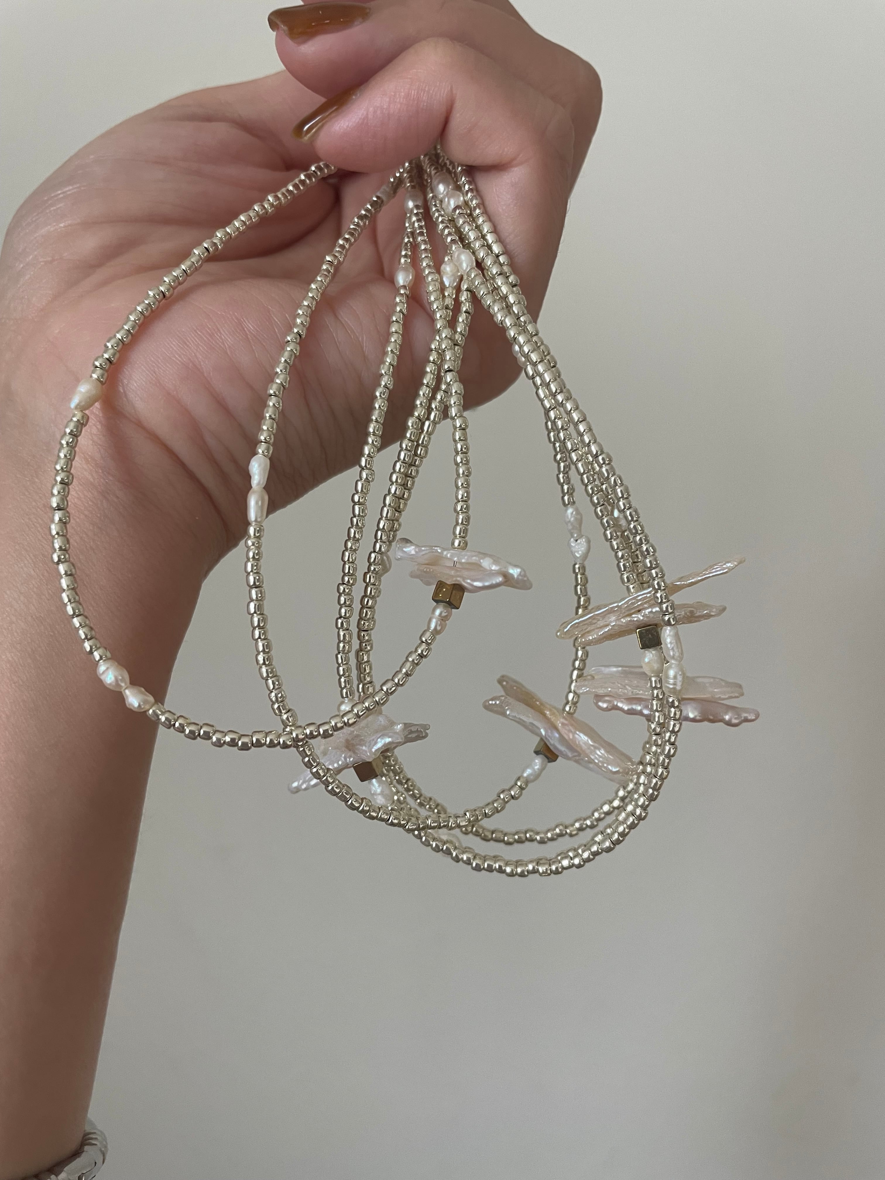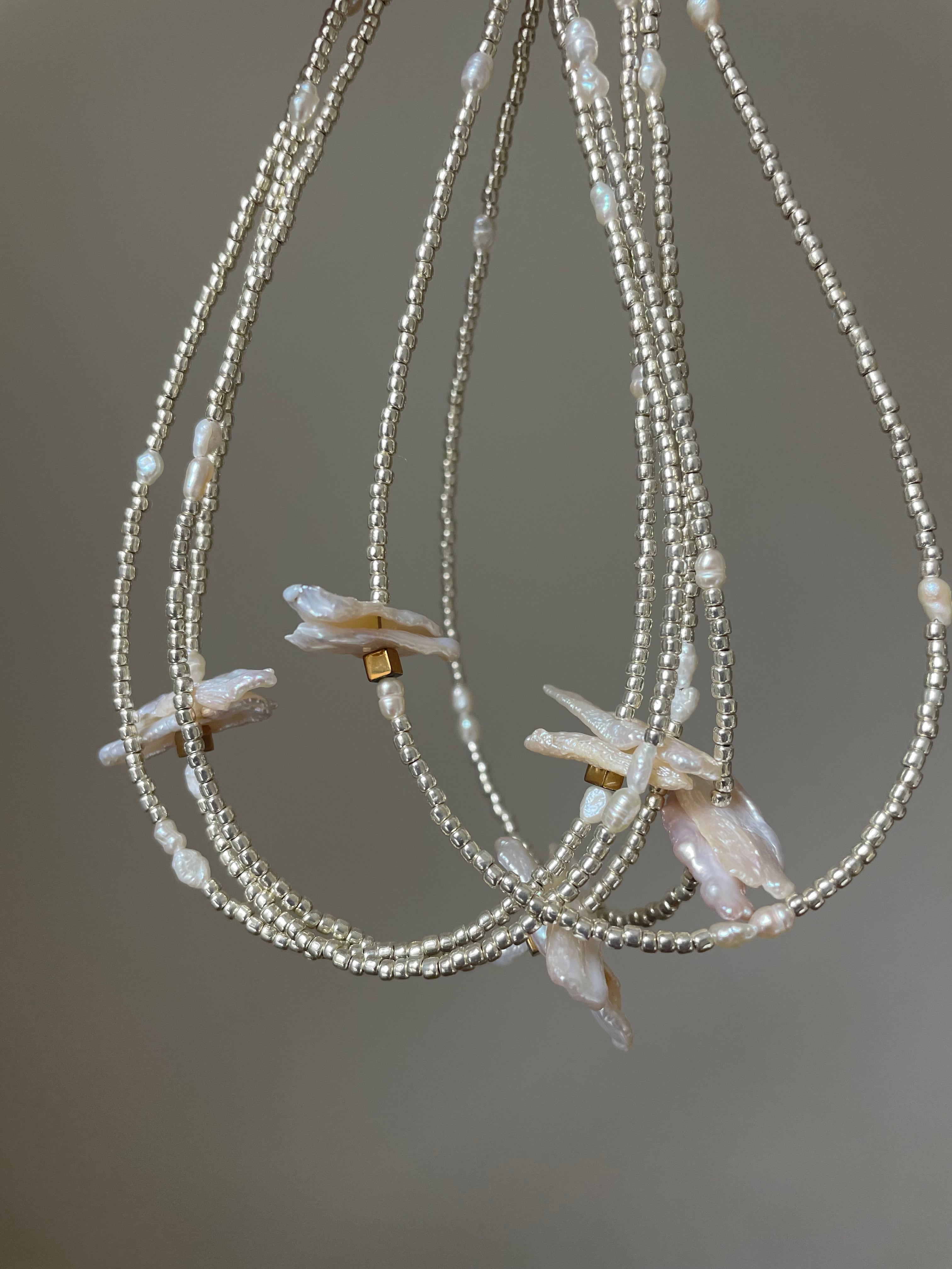 シルバービーズに一点モノの歪型淡水パールとミニ淡水パールにそっと忍ばせているスクエアゴールドでいい波長に仕上がりました。