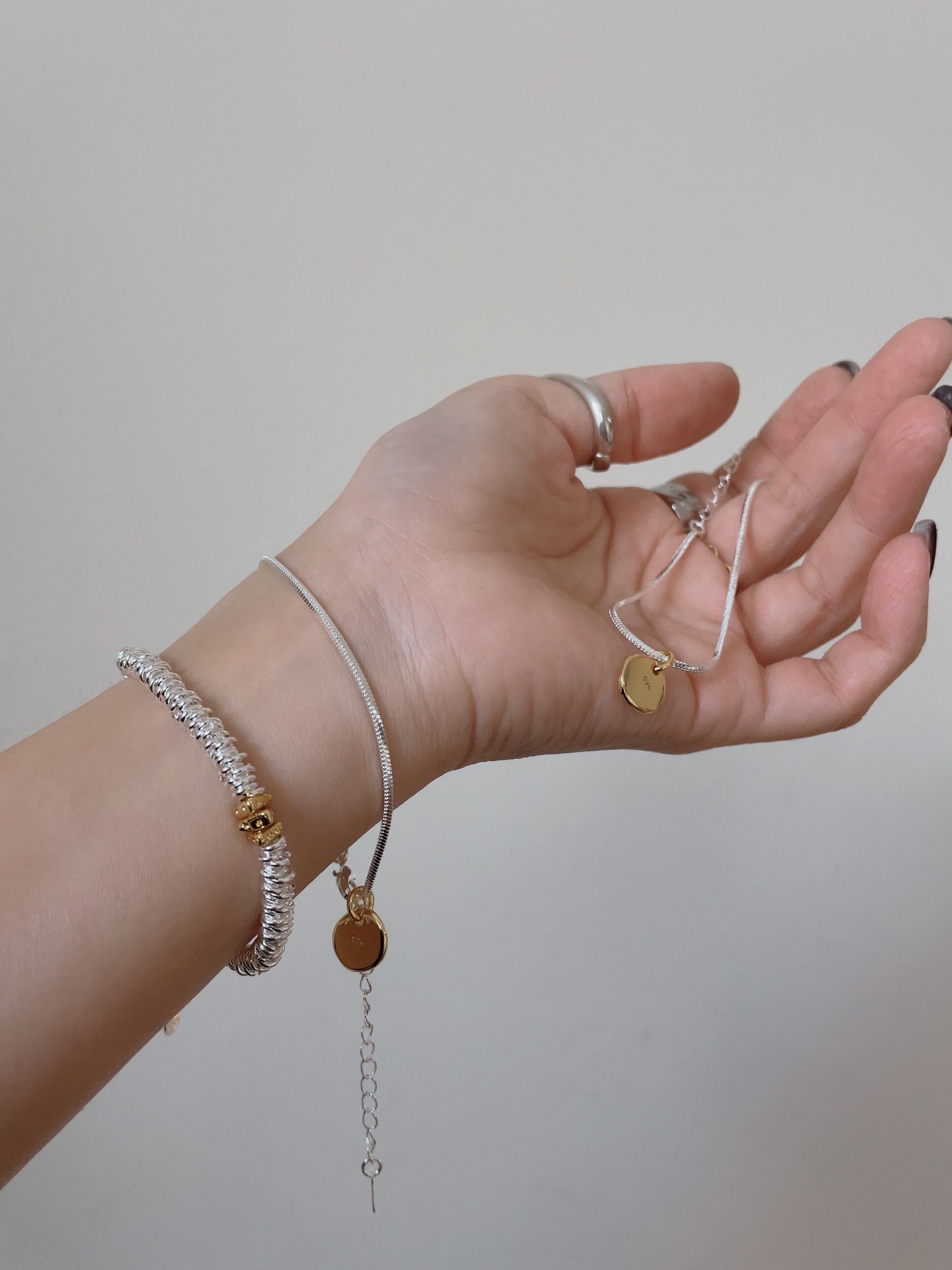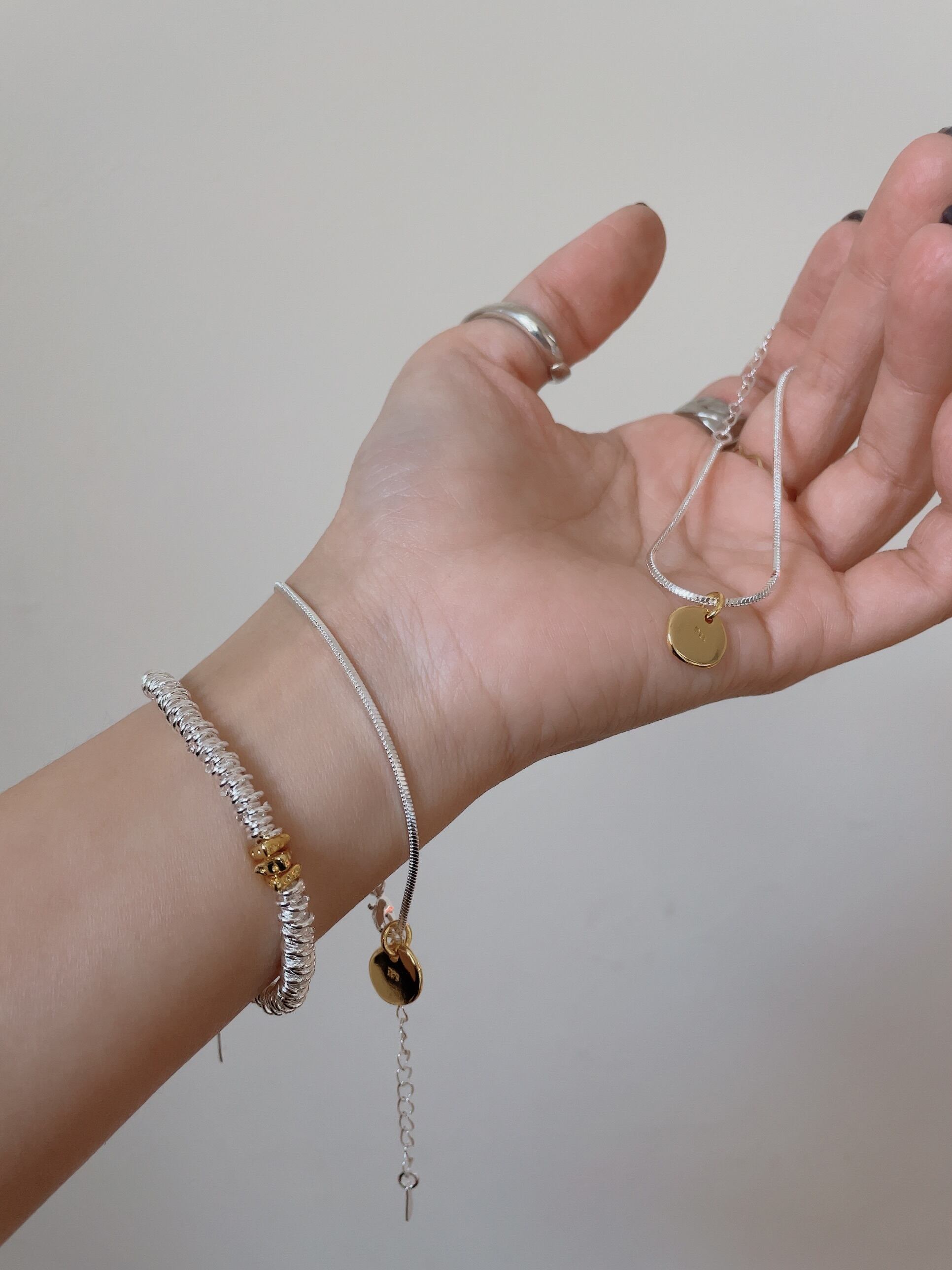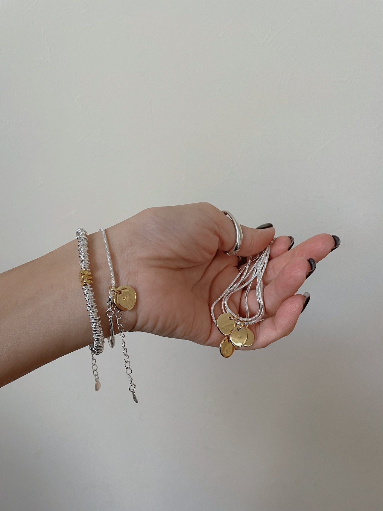 華奢な感じが好きな方は一つ付け、じゃらっとさせたいかたは是非coilbraceletとあわせてみにつけてみてください。