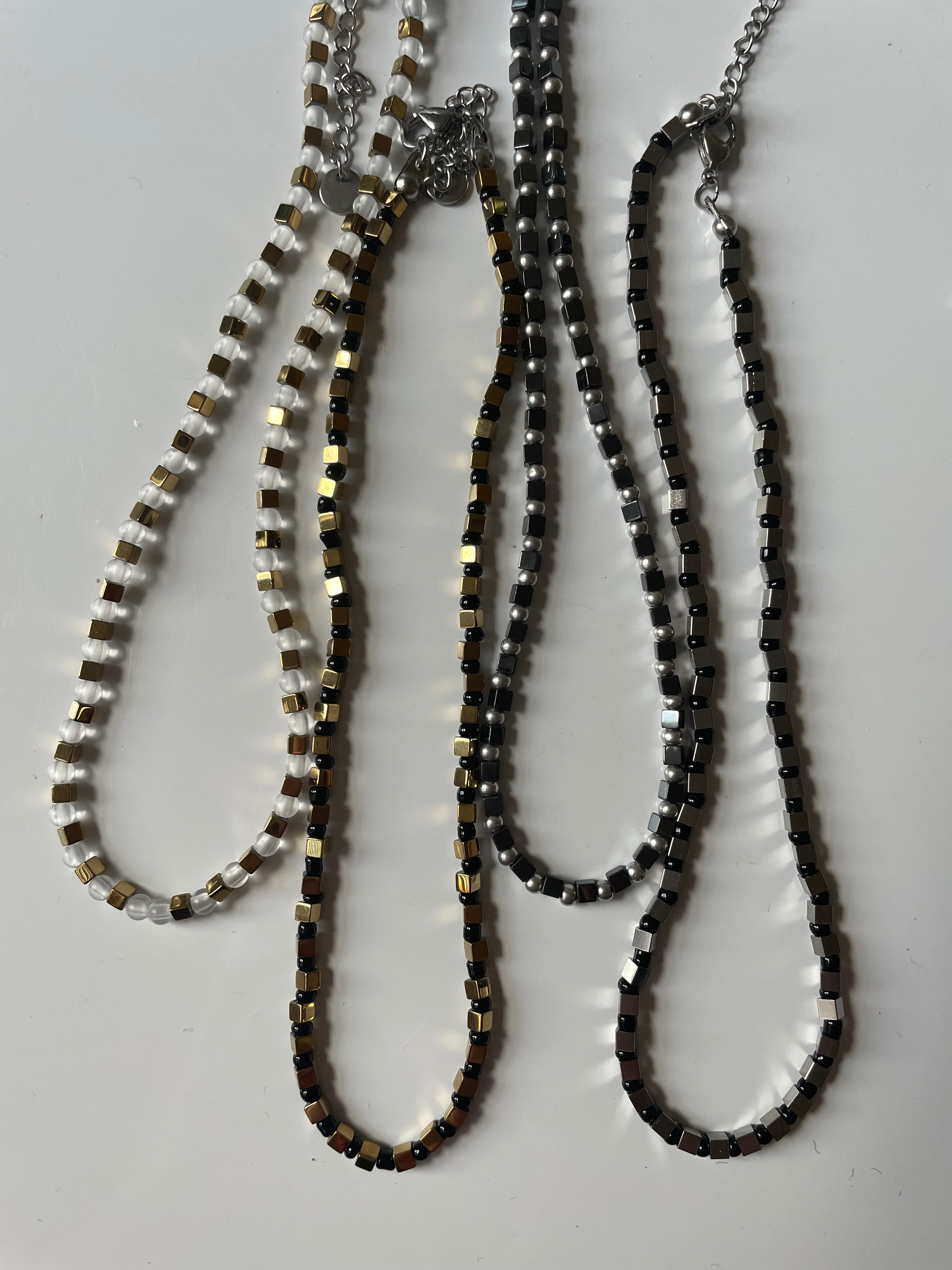 3ミリのスクエアビーズにシルバーやフロストビーズを施したネックレス。